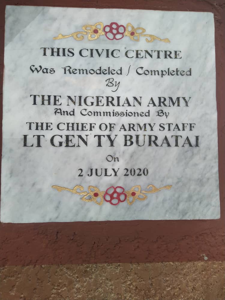 The News Agency of Nigeria (NAN), reports that the Civic Centre was remodeled and completed by the Nigerian Army as one of its civil-military cooperation projects to the community.